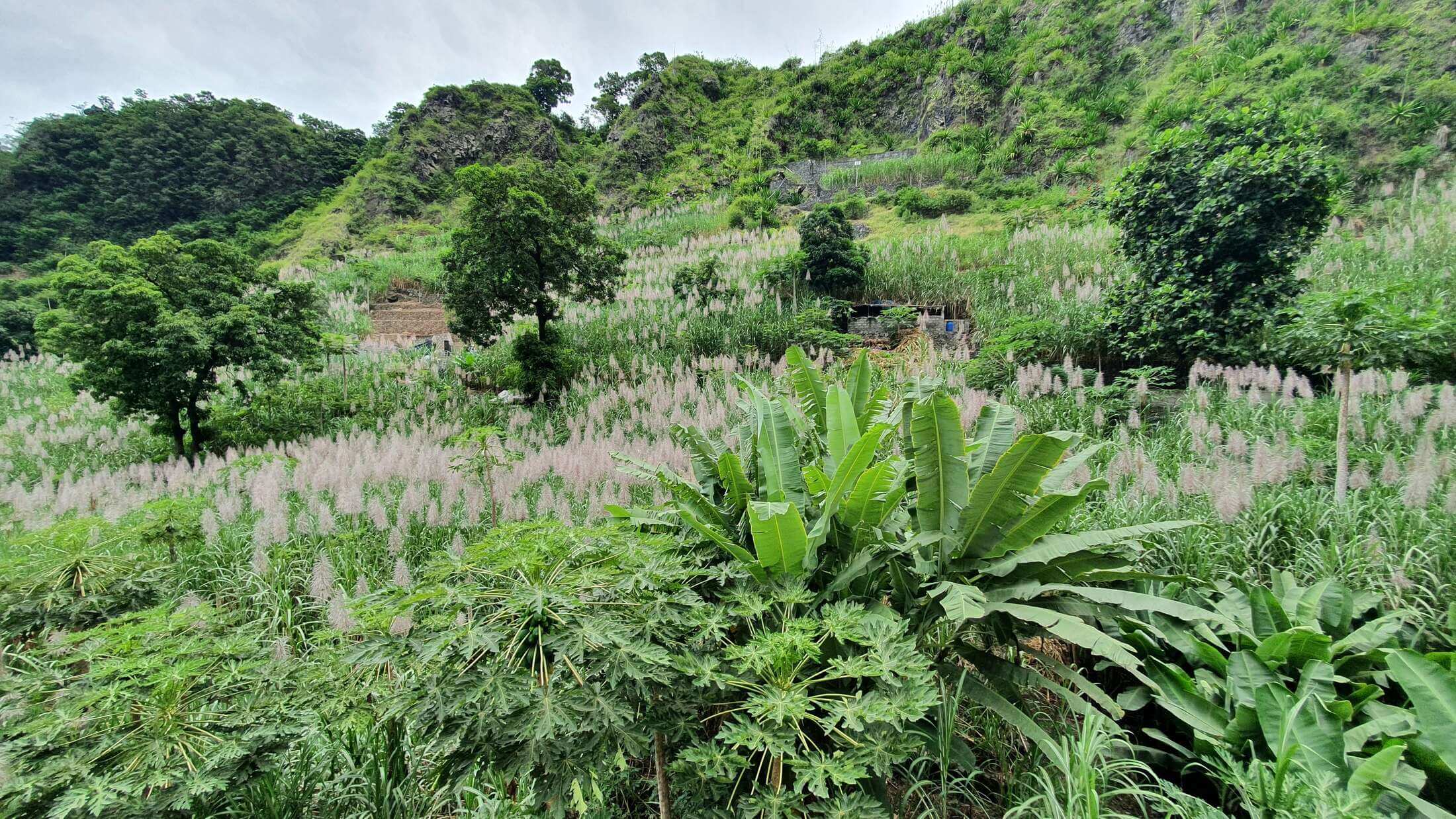 Zuckerrohr, Kokospalmen, haushohe Papayapflanzen und Bananenstauden, der heutige Ausflug beginnt in Ribeira do Paul dem grünsten Ort der Kapverden. Weiter gehts über Passagem bis nach Fontainhas, einem eindrucksvollen Bergdorf an den Hängen der Berge von Santo Antão.