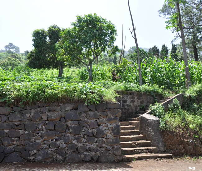Sie wandern zunächst auf schmalen Pfaden durch ausgedehnte Kaffeeplantagen, passieren fruchtbare Felder auf denen Maniok, Süßkartoffeln, Bananen, Papayas und weiteres Gemüse wächst. Mango- und Cashewbäume zeugen ebenso davon, dass der feuchtere Nordosten der Insel fruchtbar ist und eine gute Ernte einbringen kann.