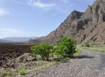 Wenn Sie zurück blicken eröffnen sich immer wieder weite Blicke auf das unendliche Meer, bis Sie schließlich in den lichten, halbeuchten Nebelwald gelangen. Auf Ihrem Weg bergan wandern Sie nun durch eines der größten zusammenhängenden Waldgebiete der Kapverden. Große Agaven stehen am Wegesrand und schillernde Eukalyptusbäume bieten Schatten auf dem Anstieg in die Caldeira. Am „Casa de Presidente“ angekommen wird der Weg zur Fahrstraße, der Sie weiter folgen bis der „Eingang“ der Caldeira erste Blicke auf den Feuerberg freigibt. Sie passieren nun verstreut bestellte Felder und immer wieder säumen rot leuchtende Rhizinusbüsche oder Purgiernußsträucher den Weg in das - nach dem verheerenden Ausbruch von 2014 - alte/neue Dorf am Fuße des Vulkans.
