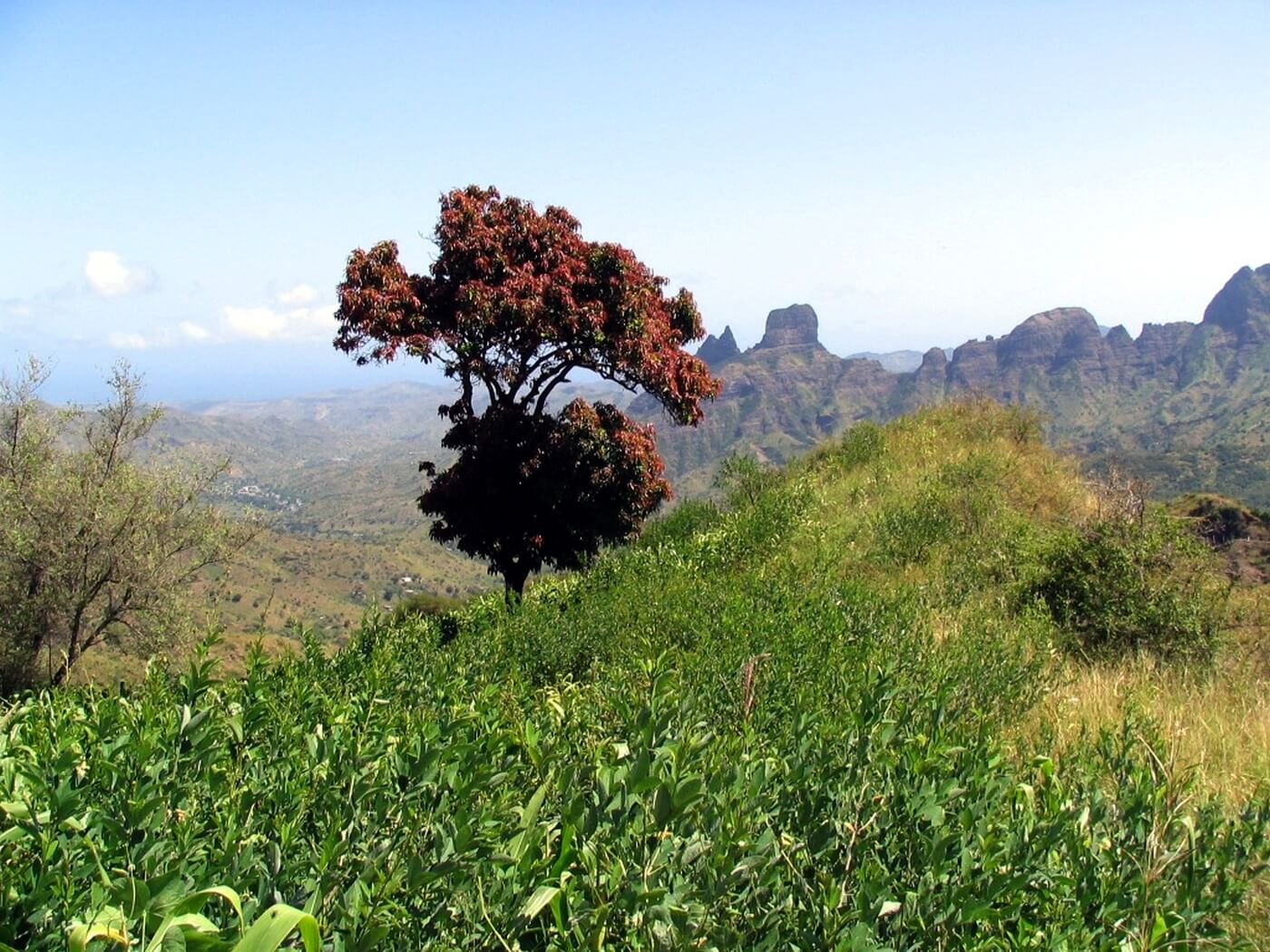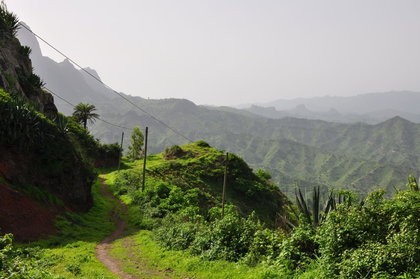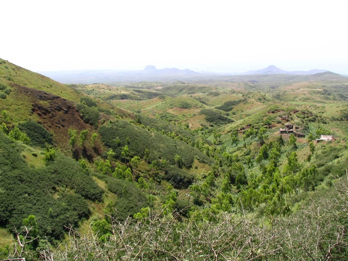 In einer immergrünen, fruchtbaren Oase beginnt dann der 3-stündige, geführte Aufstieg über Chuva Chovi: Über wellige Hügellandschaften geht es stetig und kontinuierlich bergan. Rechterhand öffnen sich immer wieder weite Blicke auf den Süden Santiagos bis hin zur Hauptstadt Praia.