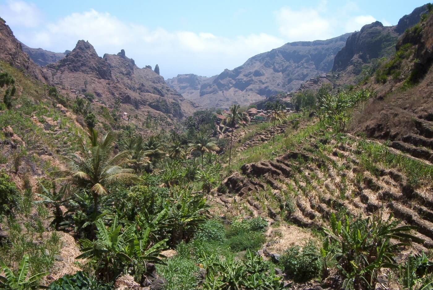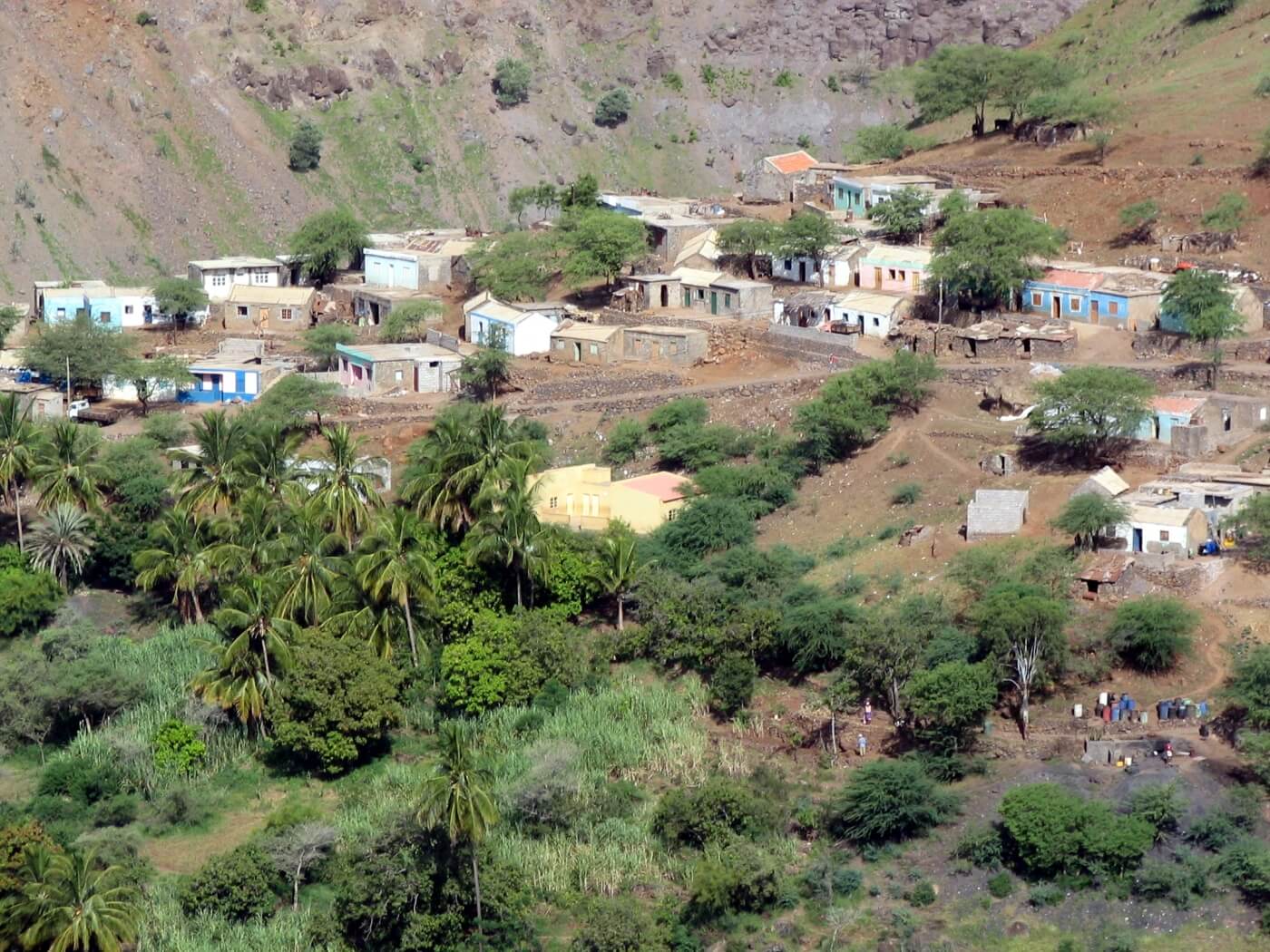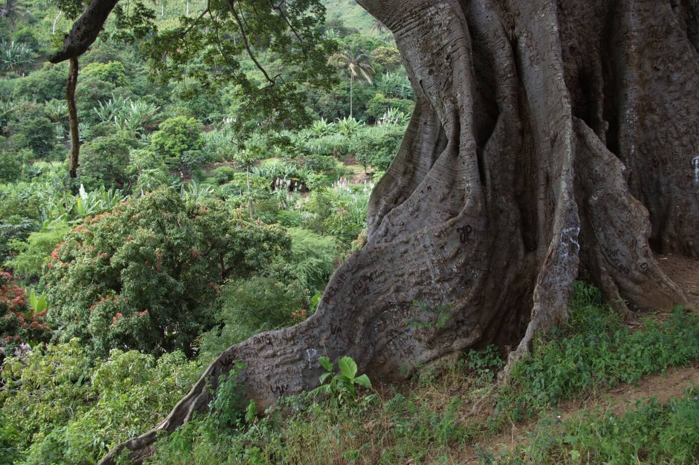 In einer immergrünen, fruchtbaren Oase beginnt dann der 3-stündige, geführte Aufstieg über Chuva Chovi: Über wellige Hügellandschaften geht es stetig und kontinuierlich bergan. Rechterhand öffnen sich immer wieder weite Blicke auf den Süden Santiagos bis hin zur Hauptstadt Praia.