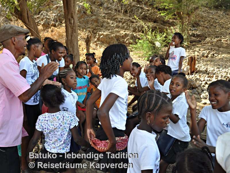 Schon bei unserem zweiten Urlaub Im Dezember 1999 waren wir mit mit 4 anderen Gästen auf einer Wanderung ins Tal von Saõ Miguel unterwegs. Höhepunkt dieser Wanderung war sicher die Live-Vorführung des Batuko der Frauen. Seit Anfang an ist der Batuko Bestandteil unserer Urlaubsprogramme auf Santiago.