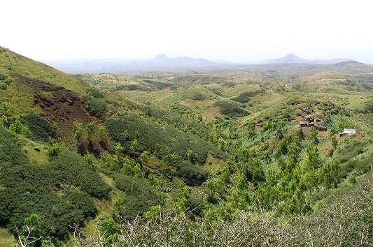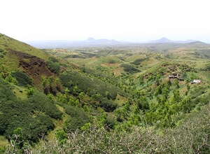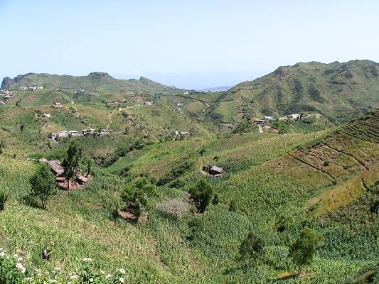Nach einem weiteren Anstieg sehen wir dann auch schon unser Ziel vor Augen, die kapverdische Sommerfrische Rui Vaz. Durch leicht hügeliges Gelände erreichen wir dann die Pflasterstraße die von Rui Vaz zum "Radarberg" Monte Txota führt. Die Quinta Montanha ist u.a. bekannt für ihr sonntägliches Self-Service Buffet