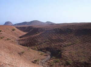 Direkt bei Santa Ana beginne wir mit dem Aufstieg. Um dann hinter Montes den von Salinero kommenden Feldweg zu queren. Noch vor Achada Loura schlagen wir uns dann rechts ins Gelände. Schon vor Chao Grande hat man im flachen Gelände weite Blick Richtung der Hauptstadt Praia.