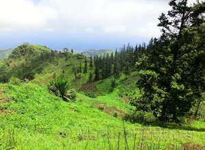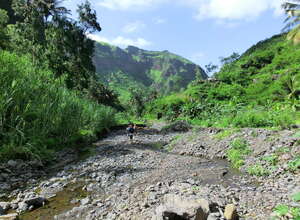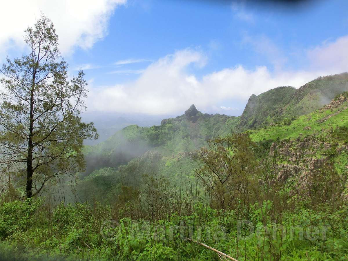 Von hier aus führ der Weg wieder nach unten. Auf schmalen Wegen geht es durch die Felder der Kapverdianer hinunter. Trittsicherheit ist gefordert, denn immer wieder liegen Steine oder Wurzeln auf dem steilen Weg bergab. Dennoch belohnt die Tour auf ganzer Stecke mit herrlichen Ausblicken und schattenspendenden Mangobäumen.
