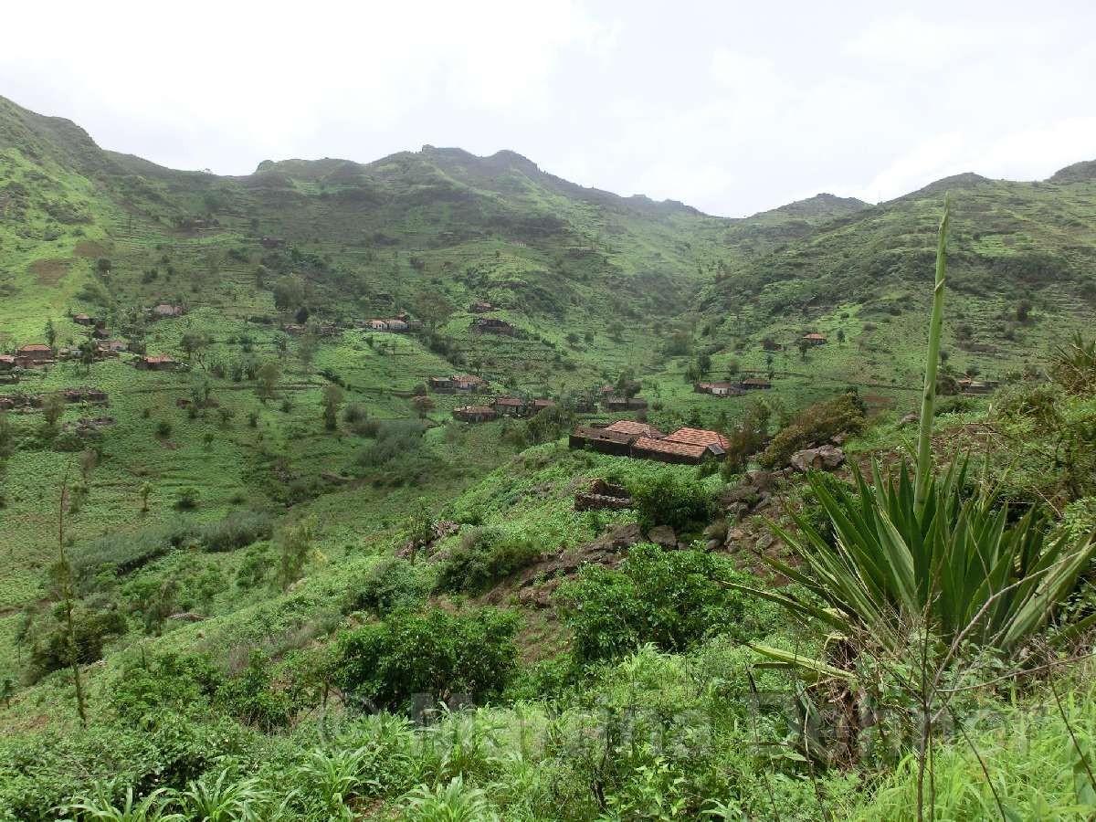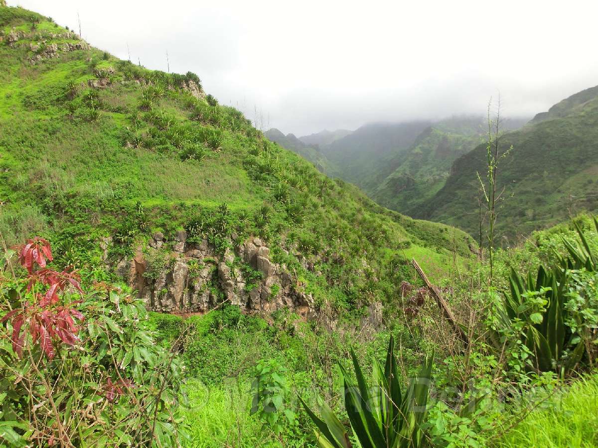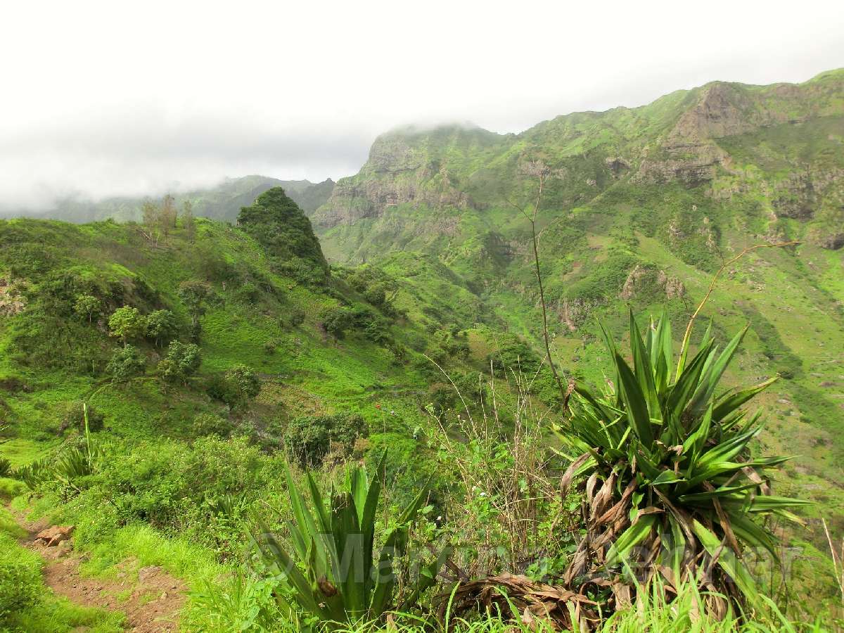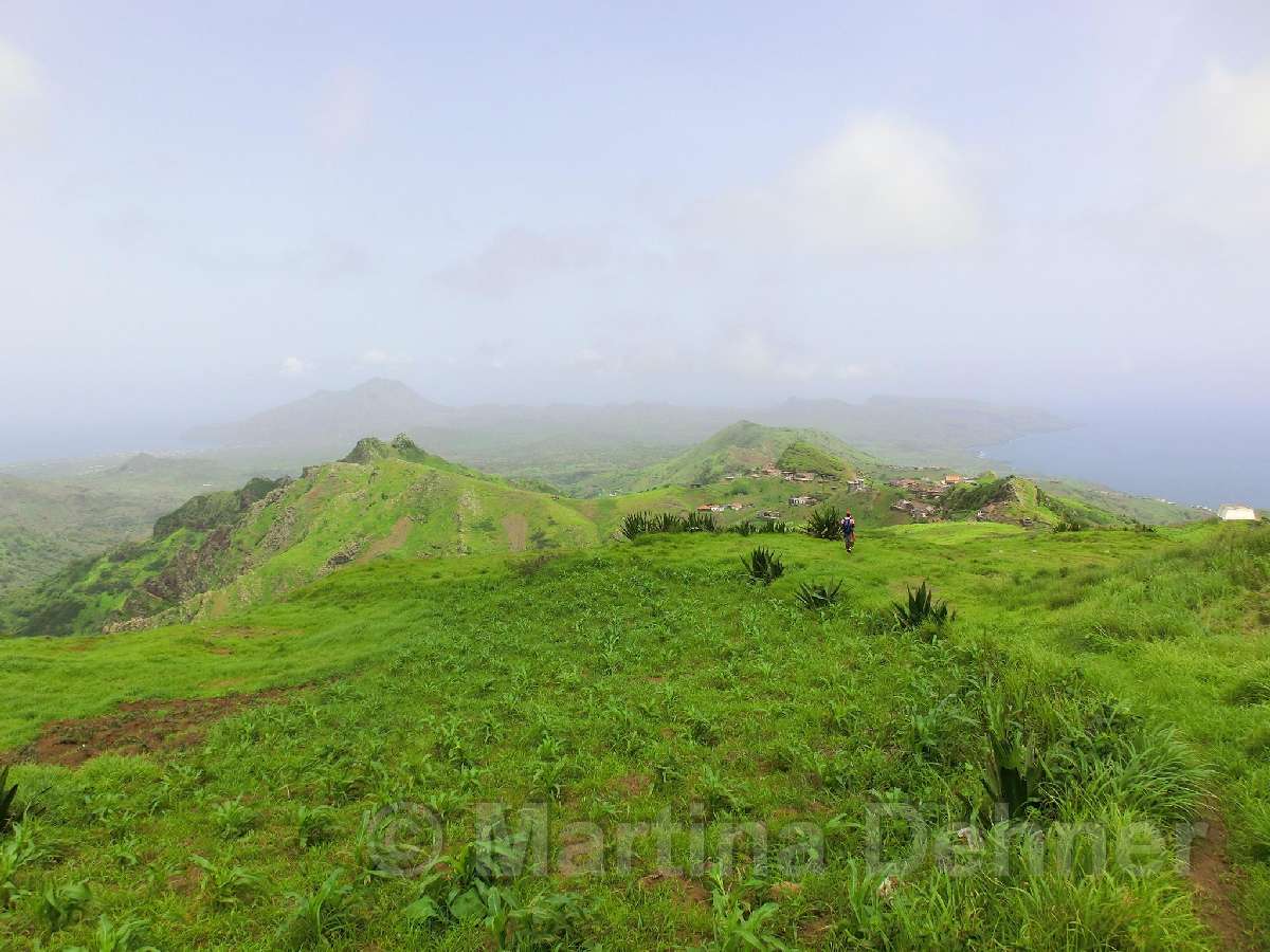 Gleich nach dem Start geht es steil bergauf. Oben angelangt geht es dann auf kurvigen Wegen sofort wieder hinab. Insgesamt folgen zwei weitere Steigungen, allerdings verläuft der Großteil der Wanderung bergab. Gesäumt ist der Weg meist von Algarven, welche meterhohe Blüten tragen, Limettenbäumen und "Língua-da-vaca"-Sträuchern. Zudem führt der Weg oft entlang oder durch Felder der Kapverder, welche dort größtenteils Süßkartoffeln und Mais anpflanzen. In der Ferne kann man auch die dazugehörigen Häuser und Dörfer entdecken, manchmal quert man das ein oder andere Haus auch direkt. Die komplette Wanderung belohnt mit tollen Aussichten. Nach etwa der Hälfte der Strecke gibt es aber eine ganz besondere Aussicht, denn man sieht die West-, Nord- und Ostküste auf einmal. Die Wanderung endet an der Hauptstraße.