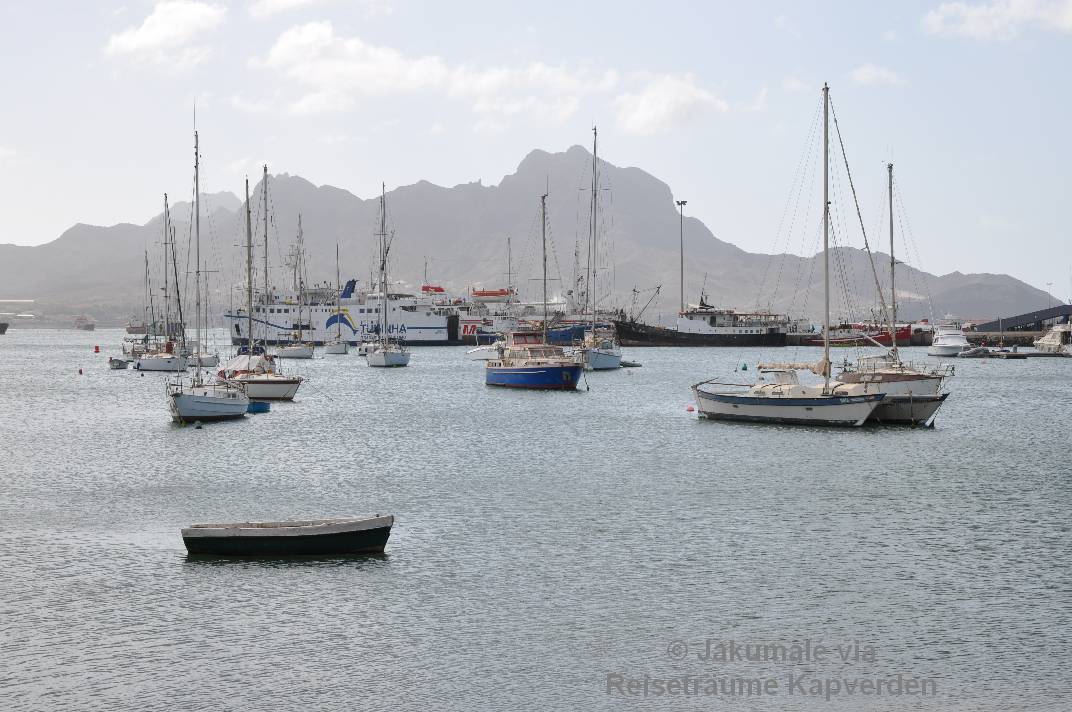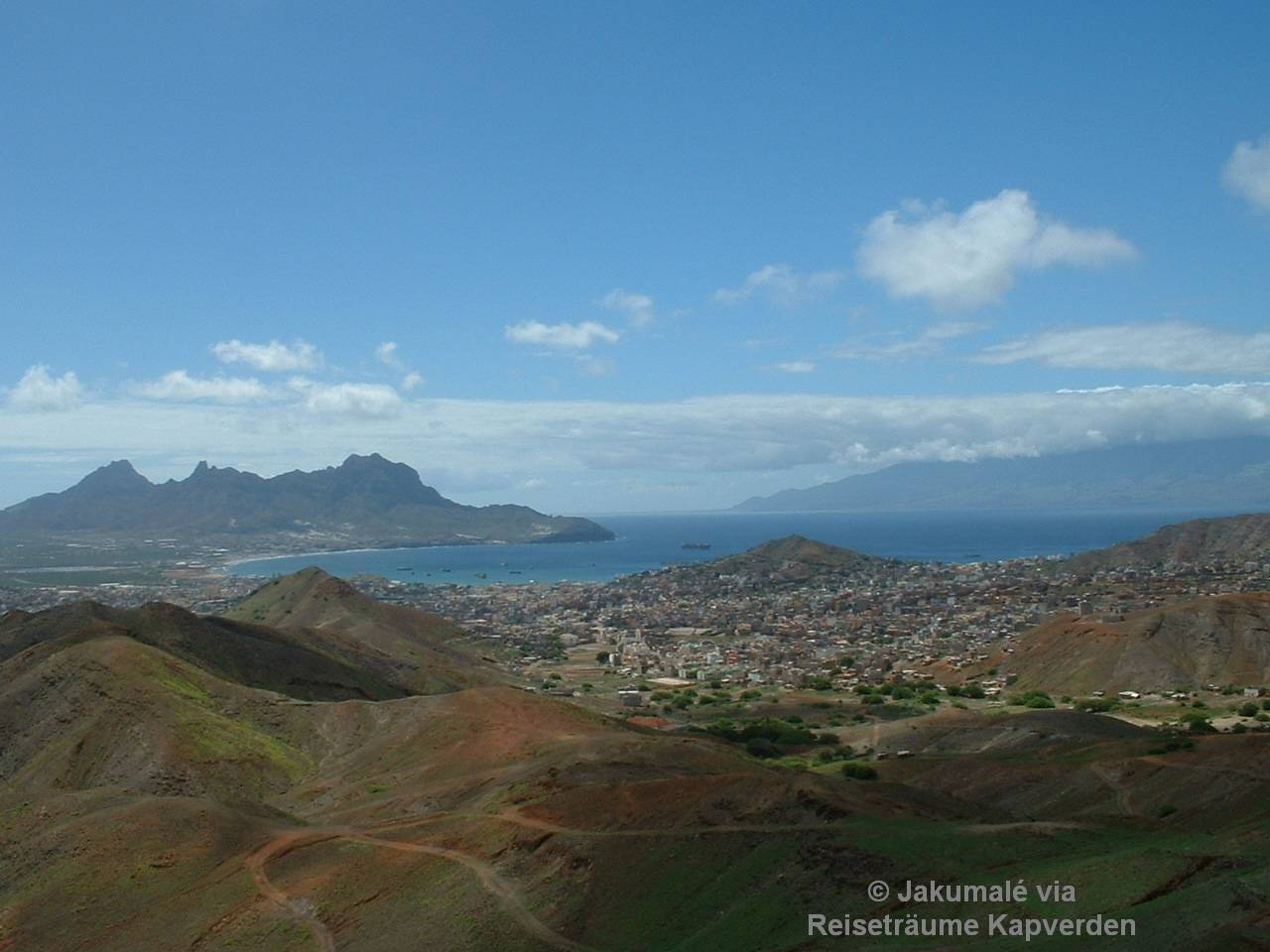 Nach einer kurzen Fahrt im bequemen Kleinbus sind wir am Fuße des Monte Verde, mit 780m die höchste Erhebung auf der Insel São Vicente. Der sich anschließende halbstündige Spaziergang auf der imposanten, kopfsteingepflasterten Bergstraße ist genau das richtige um in klarer Luft hellwach zu werden und wir genießen die Schönheit der Landschaft. Schroffe Vulkankegel wechseln sich ab mit Tafelbergen, dazwischen ausgedehnte Täler, hier und da vereinzelt kleine Siedlungen, Ziegen, die auf dem steinigen Boden nach Gräsern suchen, kapverdische Bauern, die über weite Entfernungen Neuigkeiten austauschen. Uns begegnen Frauen, die ein Bündel Feuerholz auf ihrem Kopf nach Hause tragen, Esel, so vollgepackt mit trockenen Maispflanzen, dass Kopf und Schwanz kaum zu sehen sind. Angekommen auf dem Gipfel bietet sich uns ein überwältigenderAusblick auf Mindelo und den großen Hafen, überragt von dem gewaltigen Felsmassiv des Monte Cara, dem Wahrzeichen der Stadt.
