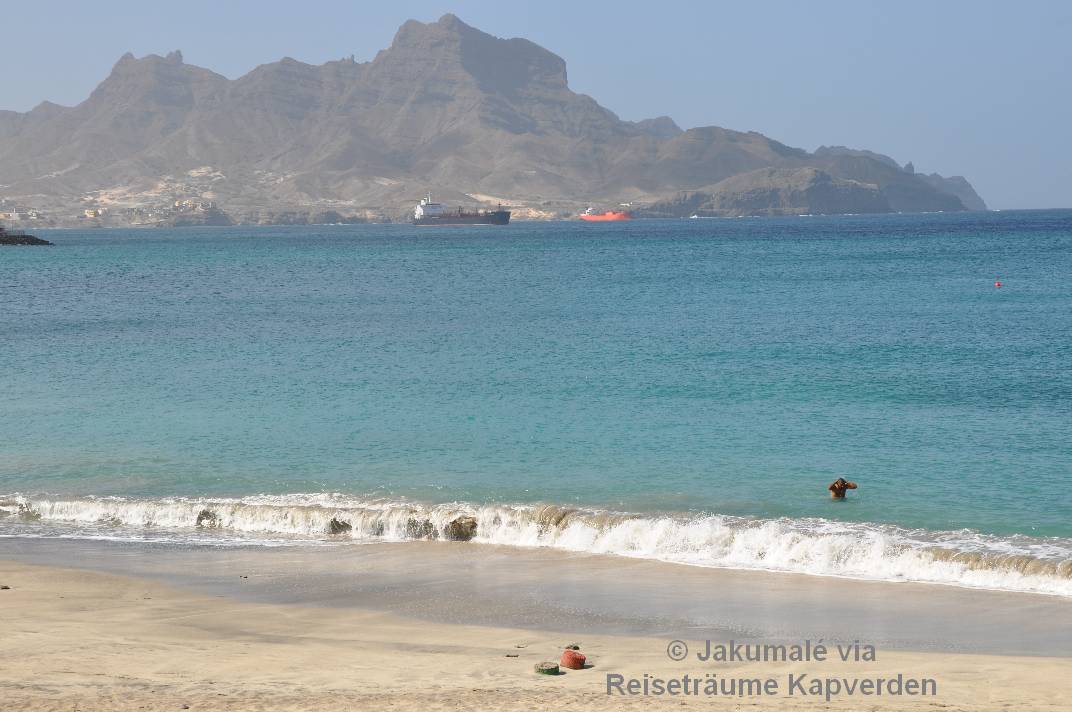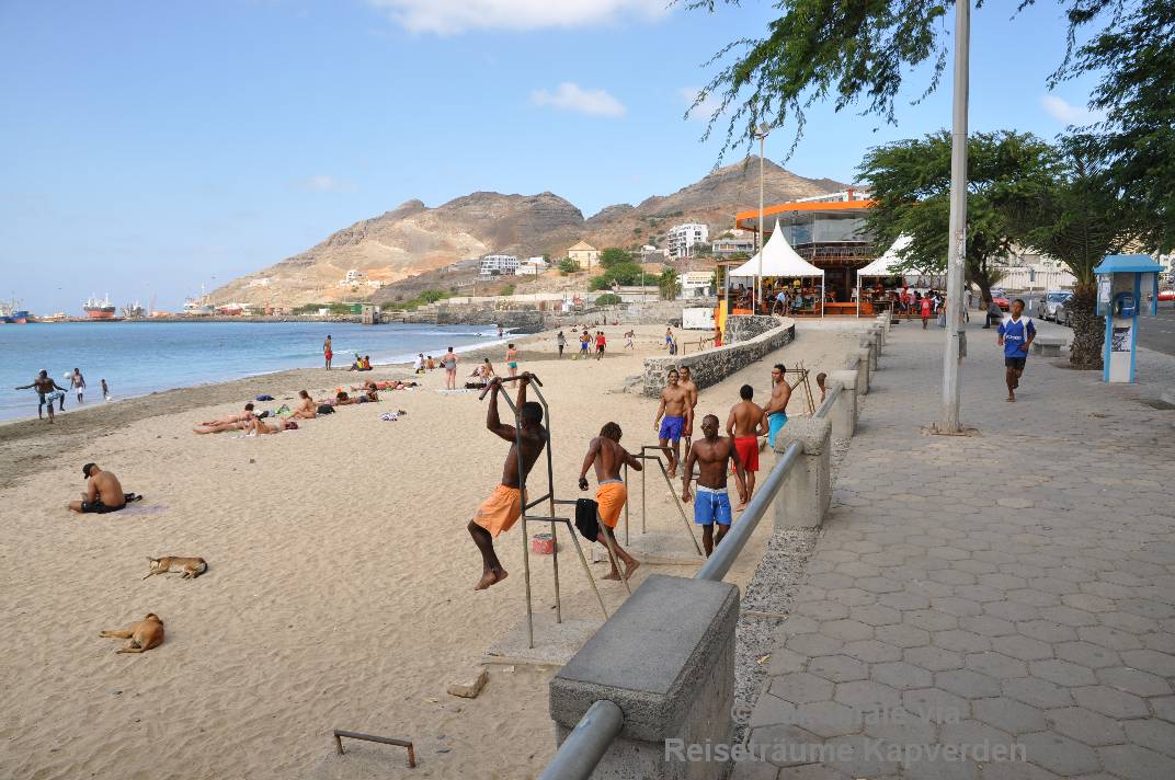Am späten Nachmittag gehen wir zum beliebtesten Strand in Mindelo, nach Lajinha. Hier treffen sich jung und alt zum entspannen. Es gibt eine ganze Reihe von Strandbars, in denen man für wenig Geld erfrischende Getränke bekommt. Der ein oder andere nutzt die Zeit für ein weiteres Bad im Meer. Es reicht aber auch, einfach nur da zu sitzen und dem gemächlichen Treiben zu zuschauen. "Cabo Verde-no stress", so ist es überall zu lesen, und es ist tatsächlich so. Hier ist alles ein wenig unaufgeregter und weniger hektisch. Die Menschen, obgleich nach unseren Maßstäben arm, strahlen eine ansteckende Lebensfreude und Ausgeglichenheit aus, die man in unseren Breiten oft vermisst.
