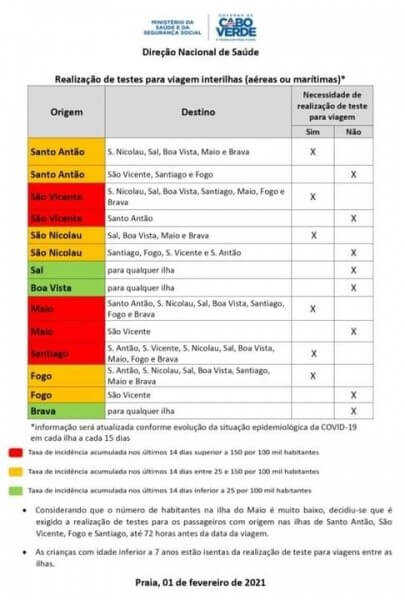 Der Ausnahmezustand auf São Vicente wurde am 18. Februar für weitere 30 Tage verlängert. Alle anderen Inseln befinden sich im Notfallzustand. Schnelltest bei Inlandsreisen sind nun nur noch bei Reisen ab Inseln mit einer kumulierte Inzidenzrate in den letzten 14 Tagen von mehr als 25 Covid-19-Fällen pro 100.000 Einwohner notwendig, mit Ausnahme von Reisen auf die Inseln, welche die gleiche oder eine schlechtere Inzidenzrate haben. Als Nachweis gilt das negative Testergebnis, das nicht älter als 72 Stunden sein darf. Inseln mit einer Inzidenzrate von unter 25 Fällen pro 100.000 Einwohnern gelten als "grün" und Passagiere auf Flug- und Schiffsverbindungen zwischen den Inseln - mit Abflug von diesen Inseln - benötigen keine Covid-19-Tests mehr.