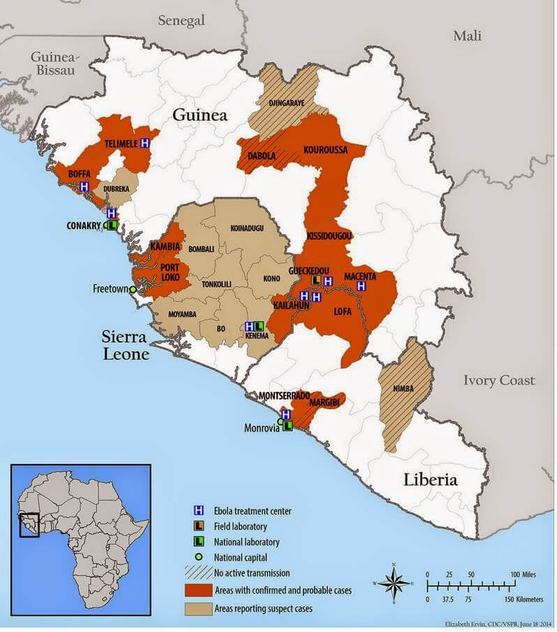 "Die Menschen in Westafrika sind ausgesprochen mobil. Grenzen sind sehr durchlässig, und die Leute reisen regelmäßig hin und her. Sie haben Familie auf beiden Seiten der Grenzen und fahren häufig zum Beispiel zu Märkten oder Bestattungen. Gerade Beerdigungen sind in Westafrika jedoch eine Hauptursache neuer Infektionen, denn dort ist es üblich, die Toten zu waschen und zu berühren. Da die Körper der Verstorbenen hochansteckend sind, wird das Virus auf diese Weise immer weiter verbreitet. Hinzu kommt, dass Ebola bislang in Westafrika nicht vorkam. Viele Menschen trauen den fremden Ärzten nicht und verstecken ihre Kranken. Es ist viel Aufklärungsarbeit nötig, damit sich die Menschen an die Ebola-Zentren wenden." (3)