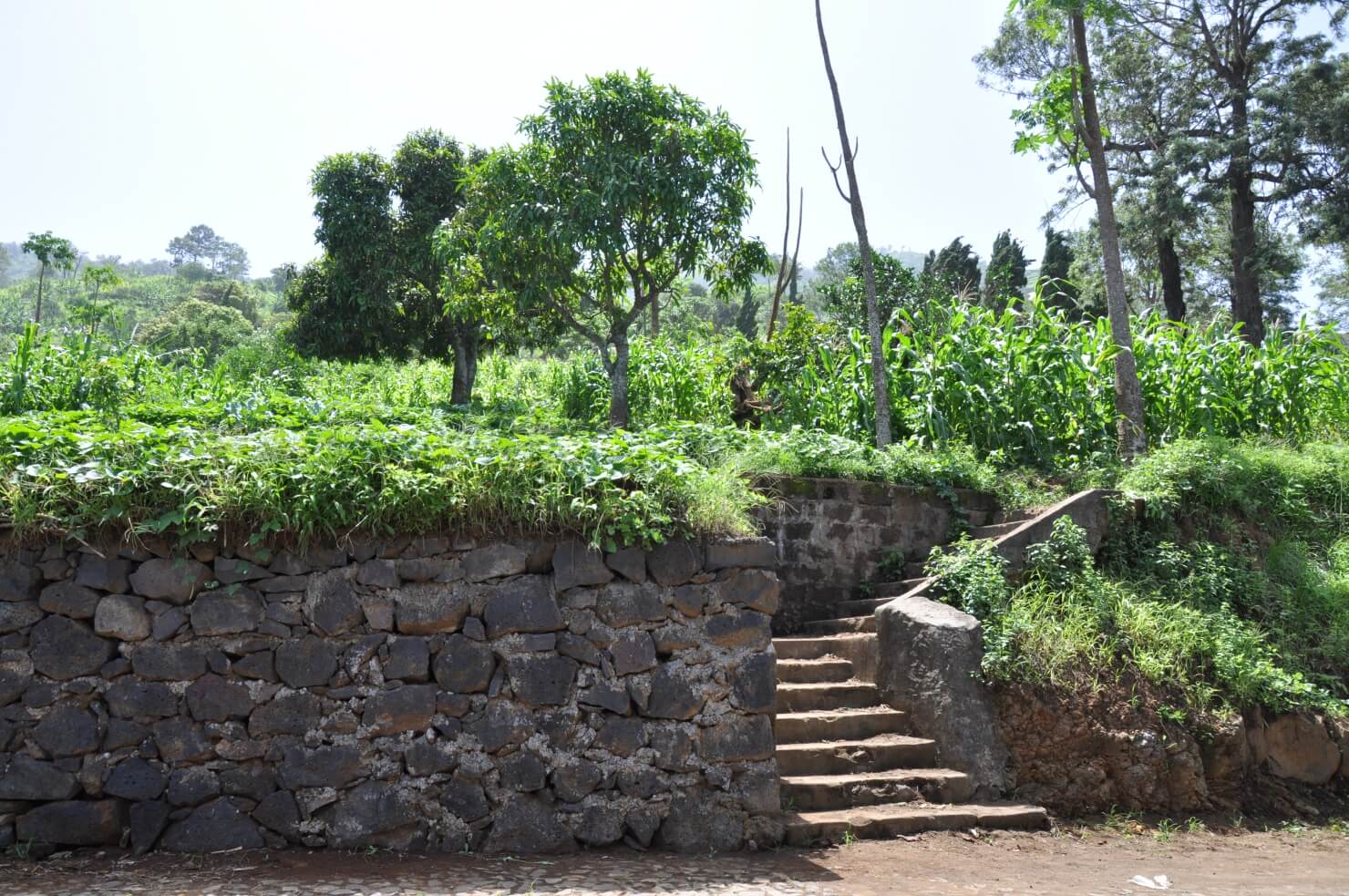Sie wandern zunächst auf schmalen Pfaden durch ausgedehnte Kaffeeplantagen, passieren fruchtbare Felder auf denen Maniok, Süßkartoffeln, Bananen, Papayas und weiteres Gemüse wächst. Mango- und Cashewbäume zeugen ebenso davon, dass der feuchtere Nordosten der Insel fruchtbar ist und eine gute Ernte einbringen kann.