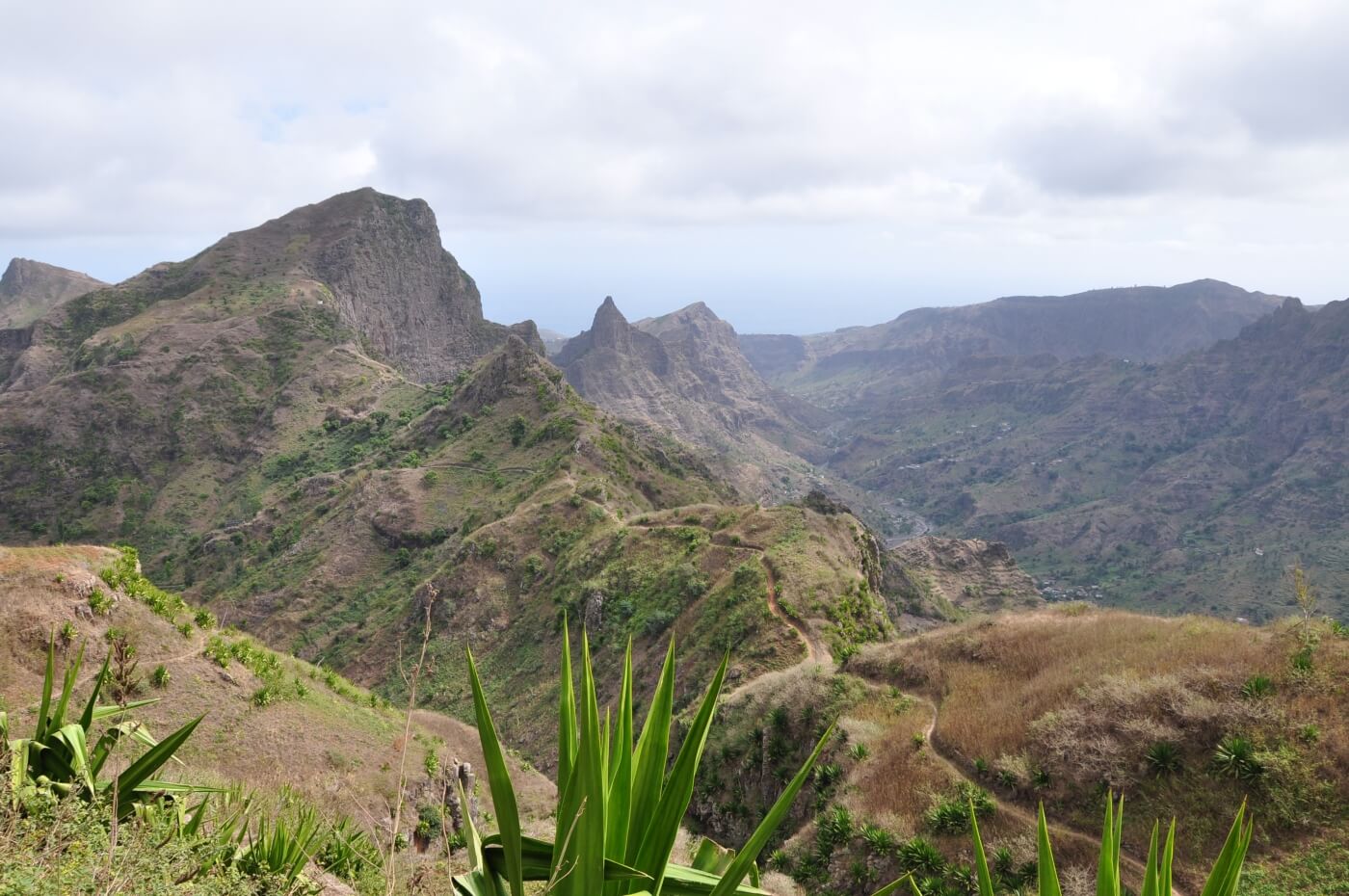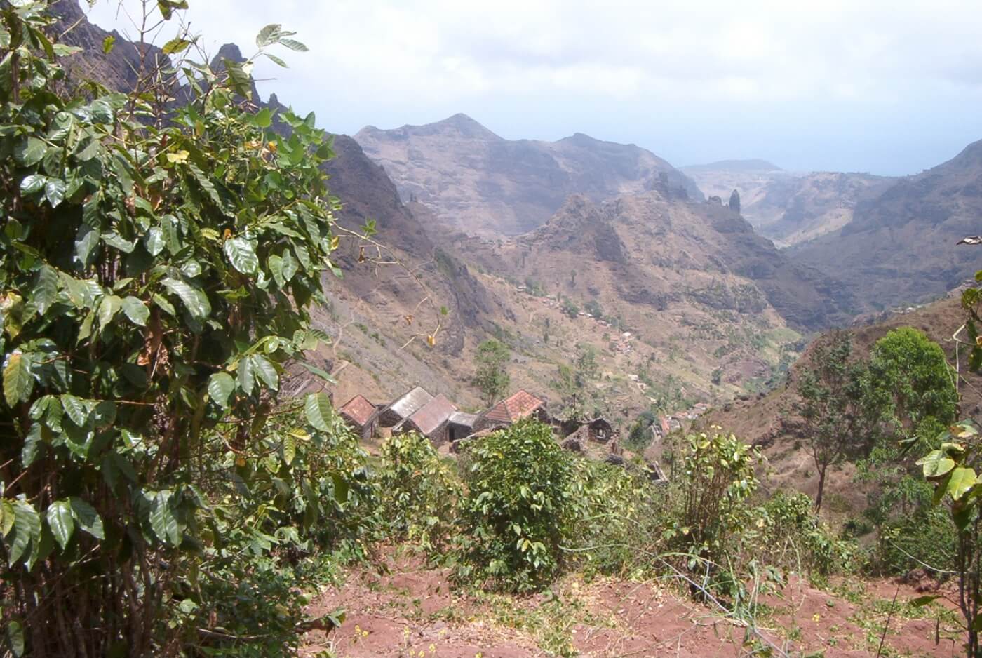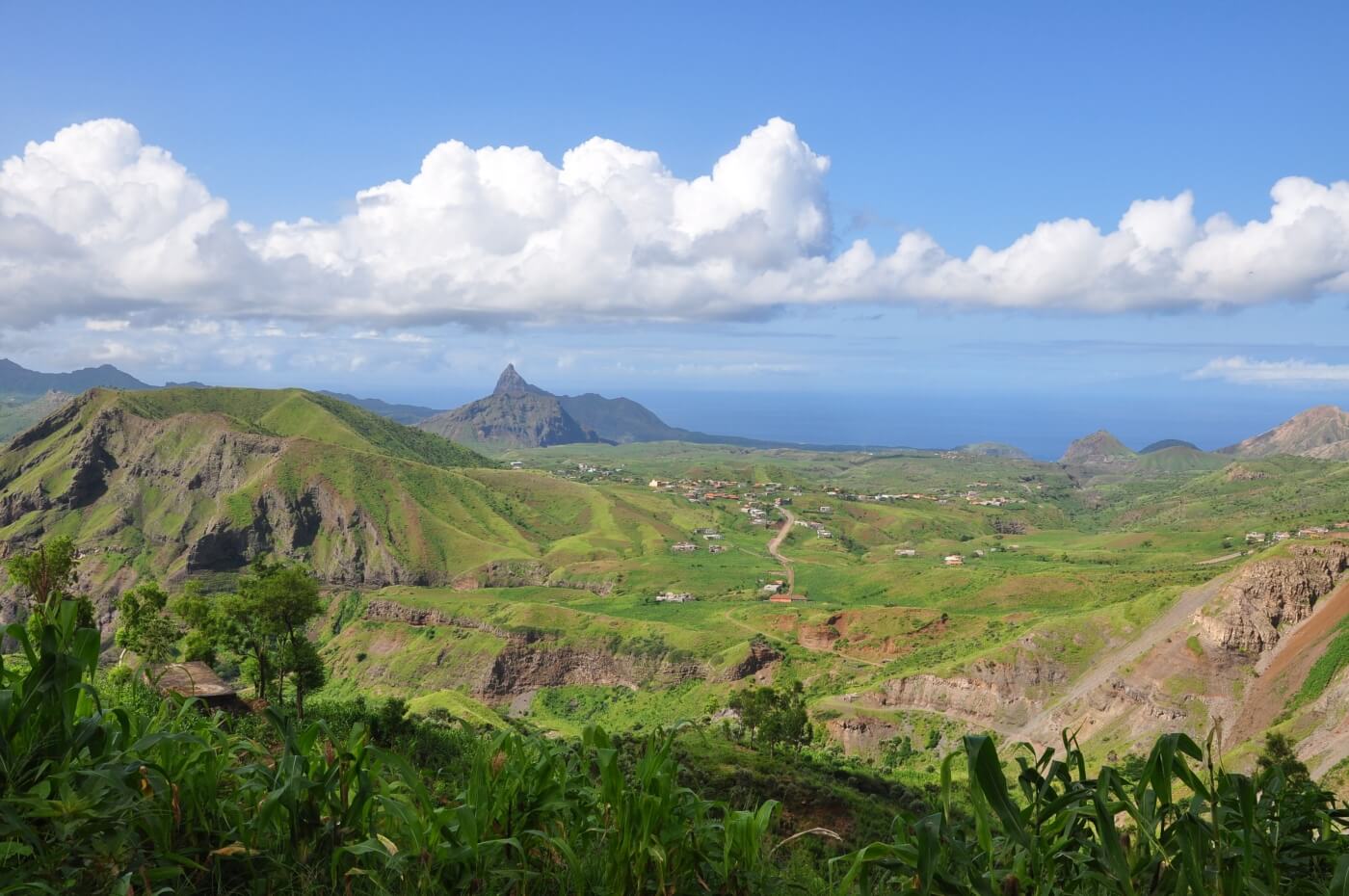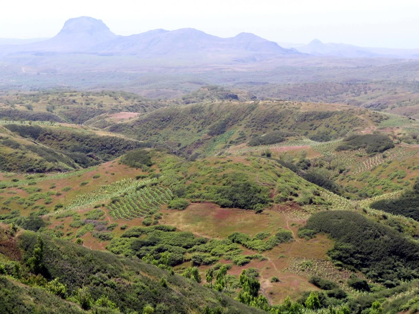 In einer immergrünen, fruchtbaren Oase beginnt dann der 3-stündige, geführte Aufstieg über Chuva Chovi: Über wellige Hügellandschaften geht es stetig und kontinuierlich bergan. Rechterhand öffnen sich immer wieder weite Blicke auf den Süden Santiagos bis hin zur Hauptstadt Praia.