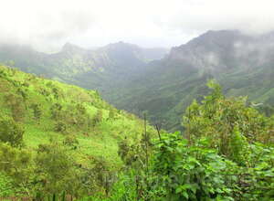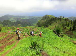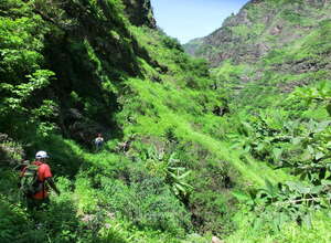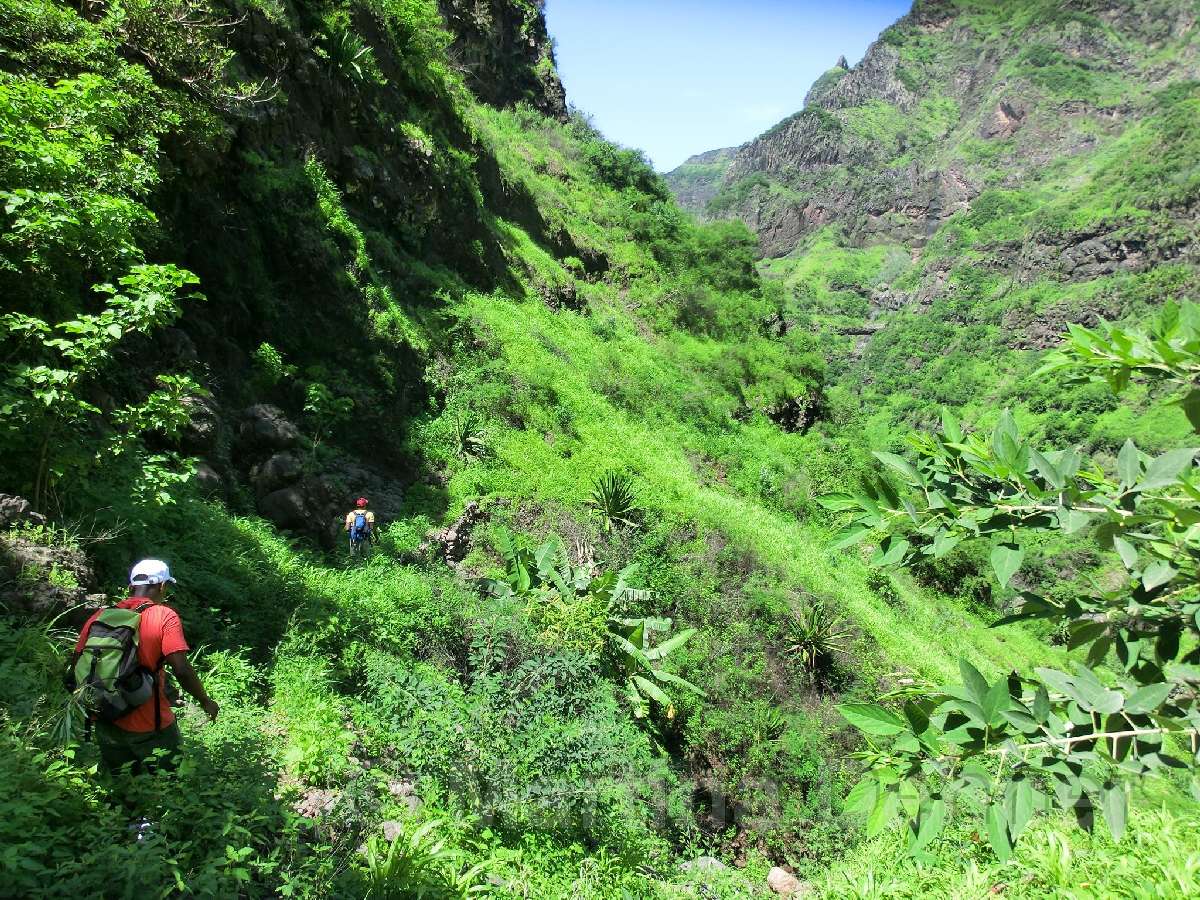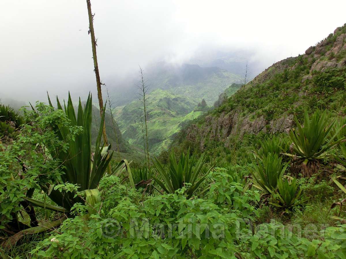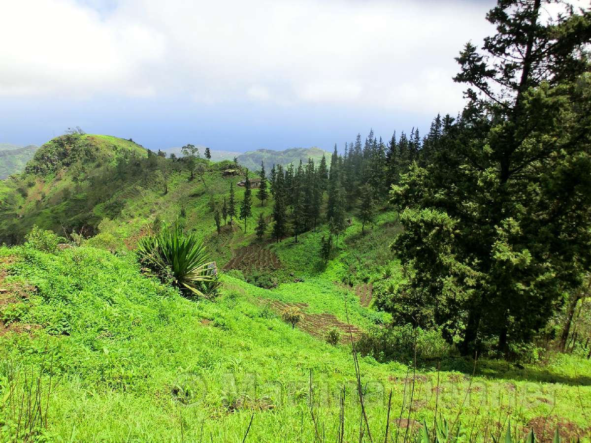Von hier aus führ der Weg wieder nach unten. Auf schmalen Wegen geht es durch die Felder der Kapverdianer hinunter. Trittsicherheit ist gefordert, denn immer wieder liegen Steine oder Wurzeln auf dem steilen Weg bergab. Dennoch belohnt die Tour auf ganzer Stecke mit herrlichen Ausblicken und schattenspendenden Mangobäumen.
