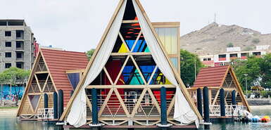 Schwimmende Dreiecks-Häuser bringen afrikanische Kultur und Live-Musik auf die Kapverden