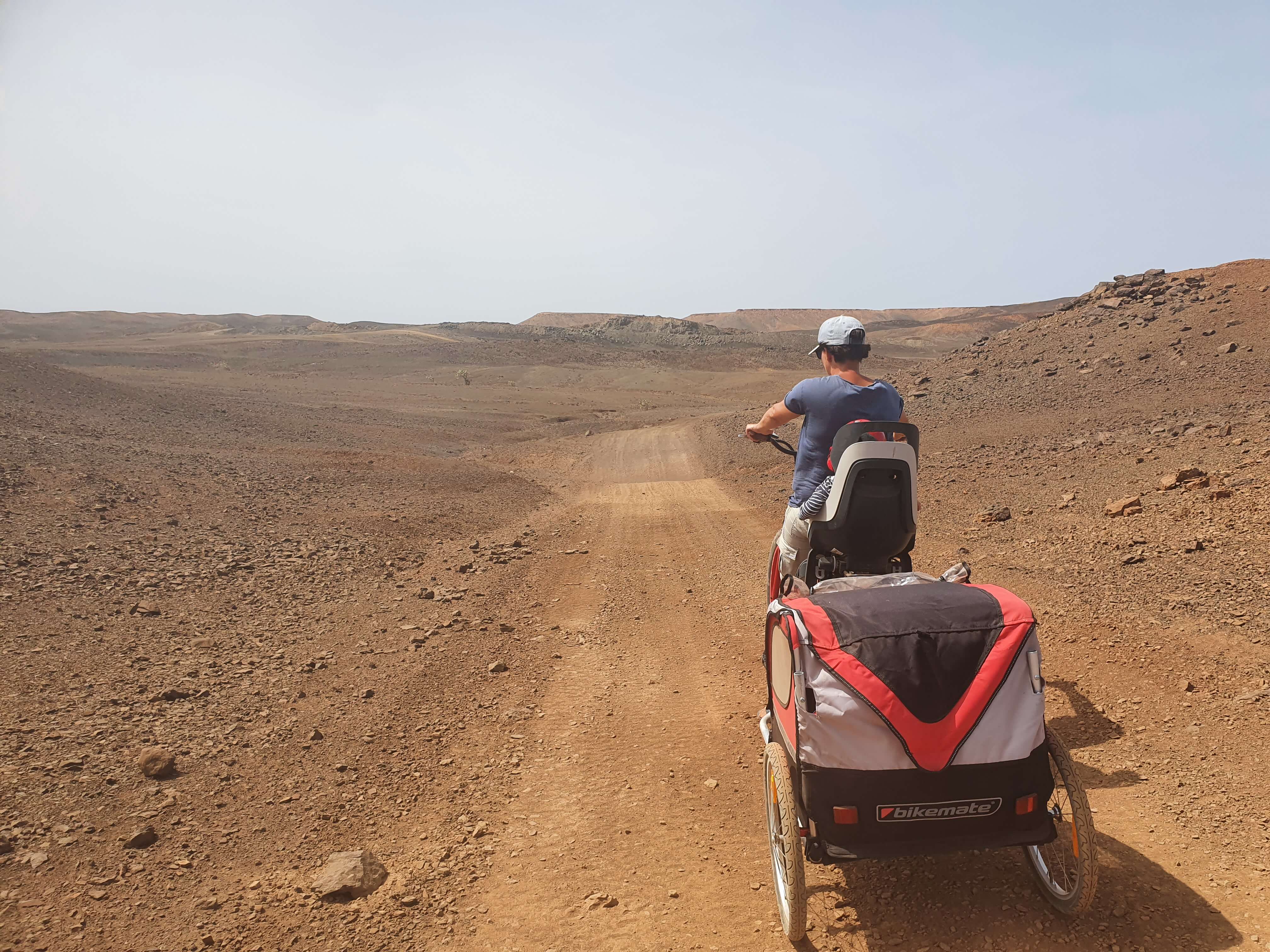 Frau mit Fahrrad, Kindersitz und Anhänger fährt durch eine wüstenartige Landschaft