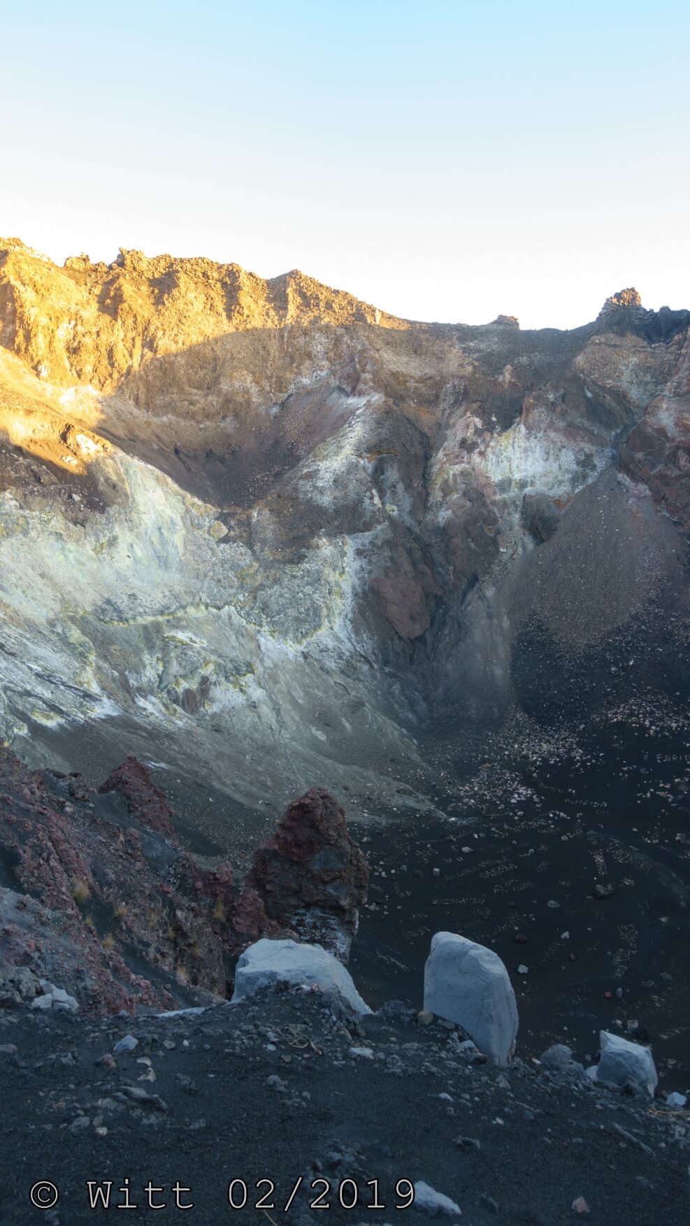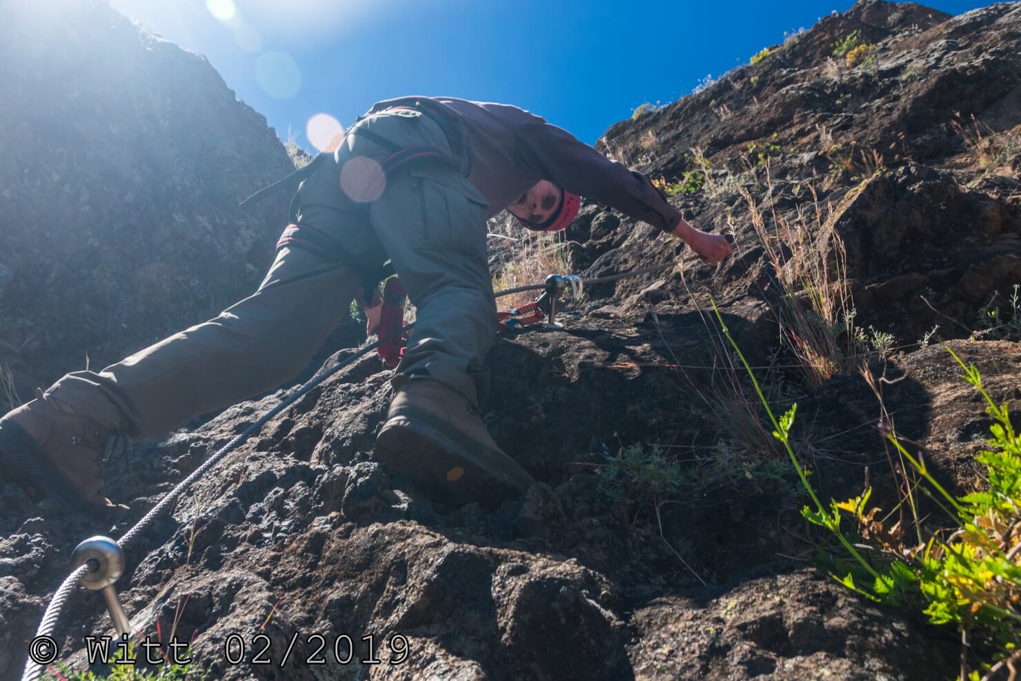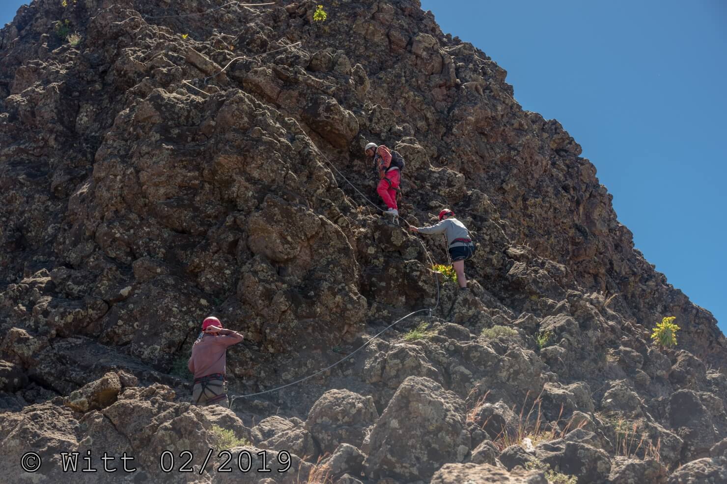 Für den letzten Tag, den Ausstieg über den äußeren Kraterrand hat uns Mustafa, abweichend vom Programm, den Kletterstieg empfohlen. (Der im Programm vorgesehene Ausstieg hätte laut Mustafa 1800 m Abstieg bedeutet, das solltet Ihr vielleicht nochmal in den Reiseunterlagen vermerken) Es gibt zwei Kletterstiege, einen leichten und einen schweren. Wir haben natürlich den leichten genommen. Etwa ein Viertel der Wanderung macht der Kletterstieg aus. Ich kann den nur empfehlen. Er ist in einem Top Zustand. Bestes Material und alle Haken sehr sauber einzementiert. Carsten und ich waren zuvor noch nie einen Kletterstieg gegangen und wir haben es locker geschafft und nicht bereut. Schwindelfreiheit und Trittsicherheit sind natürlich erforderlich. Danach ging es 3 h sehr leicht und angenehm oben auf dem äußeren Kraterrand mit schönster Aussicht.